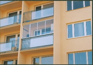 Švordielny systém Glasa, šírka 3,45 výška 1,55. V mieste pôvodného dráteného skla je polykarbonátová doska číra. Zatesnenie spodnej časti loggie je ďaľšou čírou polykarbonátovou doskou. Farba zábradlia pôvodná, ako na celom dome.