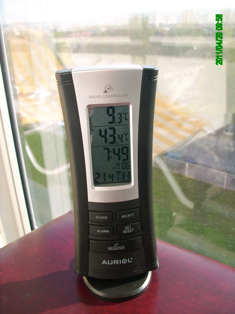 21. apríla 2011, ráno 7 hod. 49 min., vonkajšia teplota 9,3°C, teplota na loggii 43,4°C, na priamom slnku