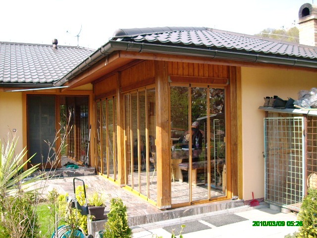 Terasa, z troch časti medzi stlpami. Kratšia trojdielna stena 1,3m x 2,2m , stred štvordielny 2,0 x 2,2 , dlhšia stena štvordielna 2,25 x 2,20.