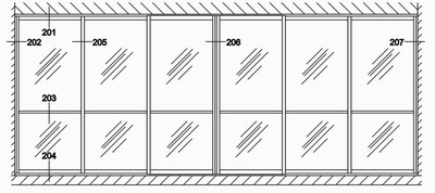 Schéma deliace steny expodul. Šesťdielny systém. Tri tabule sa posúvajú doprava, tri doľava v strede je stlpík.