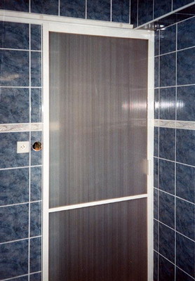 Kúpelňové posuvné dvere z tenkorámového systému Expodul. Výpň polykarbonátová doska farby bronz.