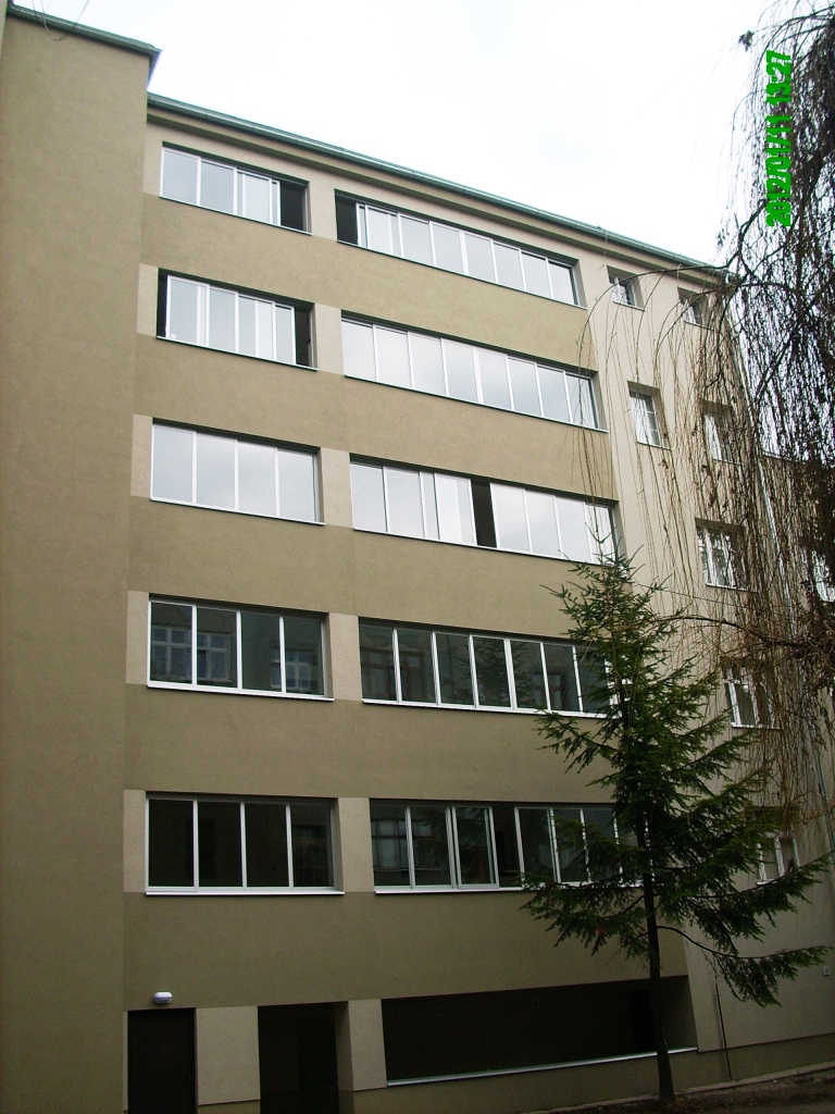 Celkový pohľad na fasádu obytného domu, po zasklení pavlačových okenných otvorov systémom TermoPlus do 1,5m. Pravá časť.